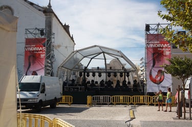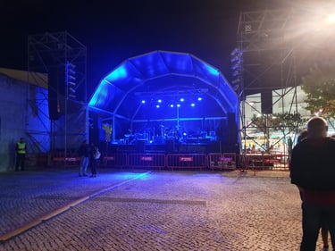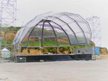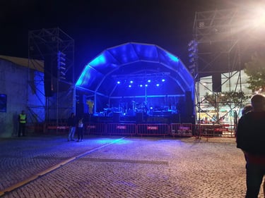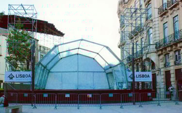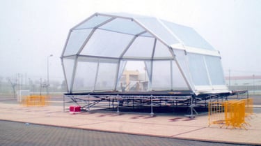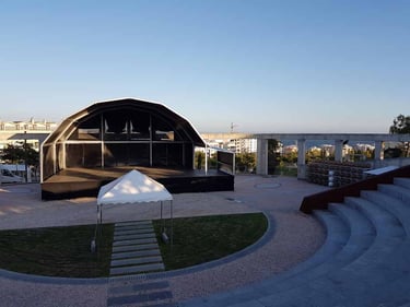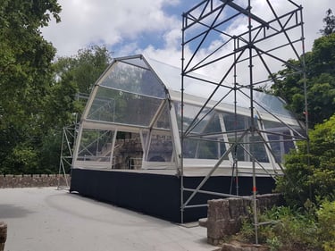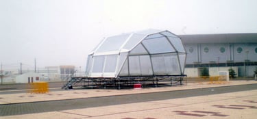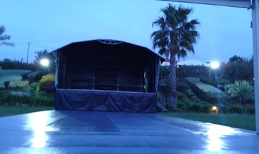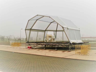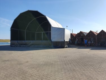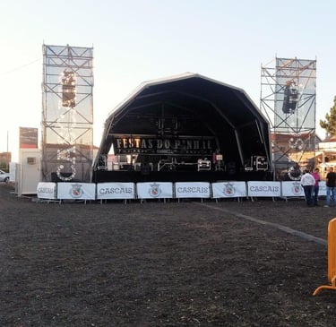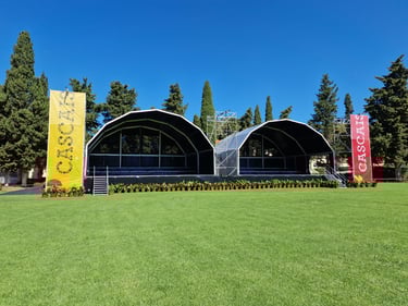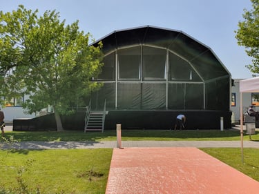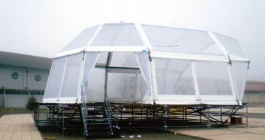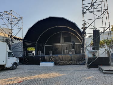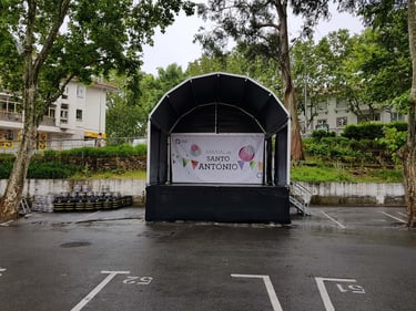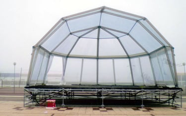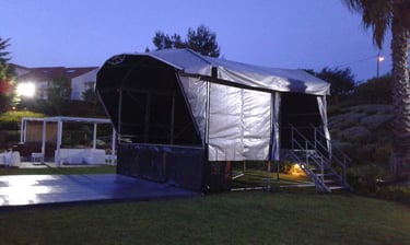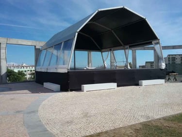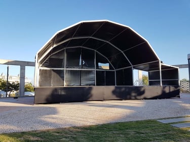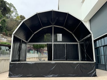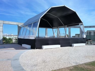 Estrutura em alumínio e lona cinza prata por fora e preto por dentro.